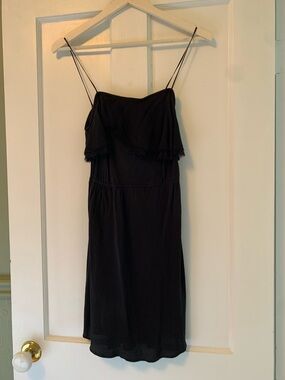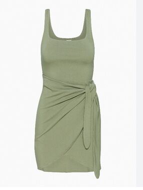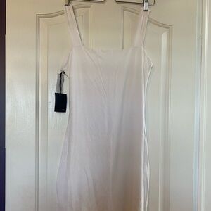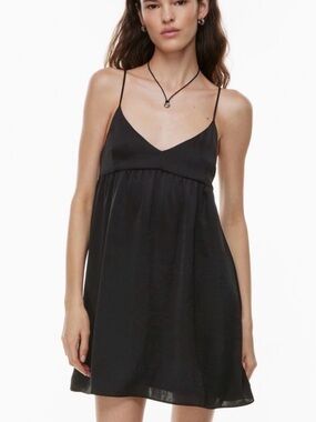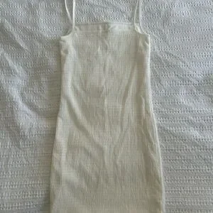 Cream textured mini dress from Wilfred. Features thin spaghetti straps, a fitted shape, and a subtle crinkled texture throughout. Fully lined with a scalloped hem.