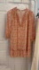 Elegant peach dress with paisley design. Features delicate ruffles.