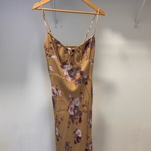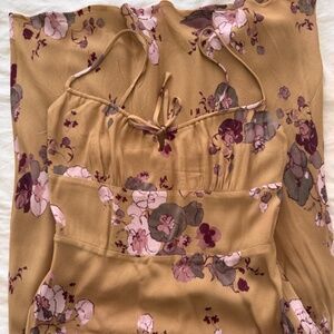 Wilfred Bellow Midi Dress in size US 8. Worn once and in excellent condition with no flaws. Designed in a golden yellow base with an allover pink and mauve floral print. Features thin straps, a scoop neckline with front tie detail, and a straight midi-length silhouette.