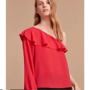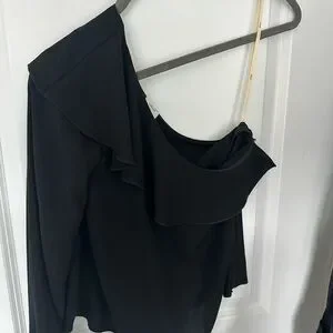 Asymmetric one-shoulder design with soft ruffle detail. Smooth drape and clean lines. Sleek silhouette for dressy or casual styling.