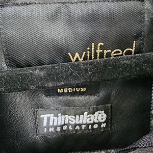 Wilfred medium length jacket. 100% Leather Trim. Thinsulate lining making it light but warm. Inside has a cellphone, earphone and money pockets. outside shell is in very good condition. The inside has a tiny bit of pilling. Missing hood.