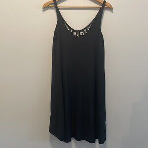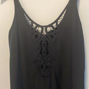 Elegant black dress with lace detail. Sleeveless design. Perfect for any occasion.