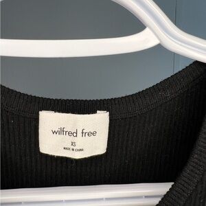 This stunning black bodycon dress by Wilfred is perfect for a night out. Featuring a chic halter neckline and a daring backless design, it offers a sleek and sophisticated silhouette.