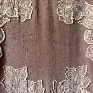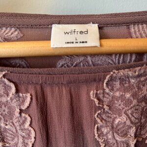 Lightweight sheer material with with floral accent. The length of the blouse is slightly cropped. Only worn once. Excellent condition; completely undamaged. Wilfred called the colour "caban"; I'd describe it as a dusty rose or light mauve.