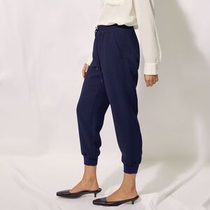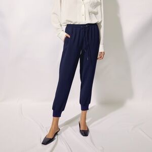 No actual jogging necessary. These joggers have a soft, elastic waist with a drawcord and ribbed cuffs at the ankles. They're made with smooth Japanese crepe that has a matte finish and drapes beautifully.