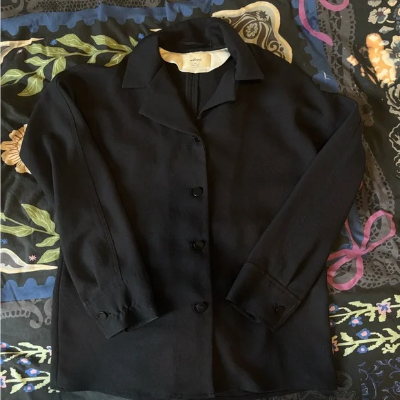 Old wilfred style button up, similar to Freeform shirt. Buttons have so wear and a small pull in the sleeve. Size XXS in black, fits slightly oversized. Not sold anymore