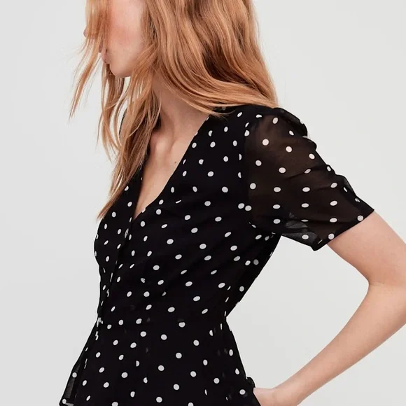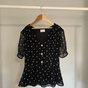 This is a semi-sheer blouse with princess sleeves and a soft peplum. It's made with billowy, chiffon-style fabric.