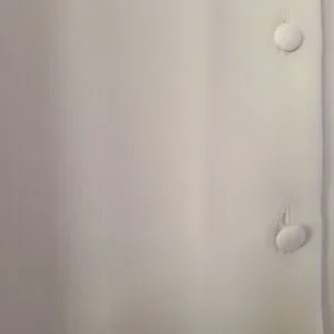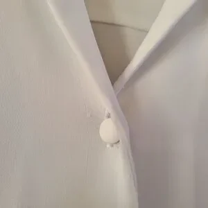 white button-front blouse, long sleeves and covered buttons for a polished finish.