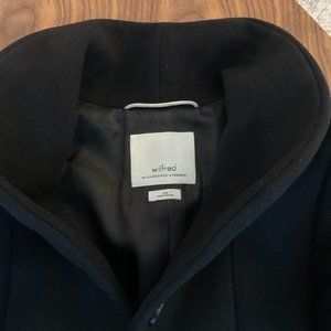 Wilfred Cocoon coat in black size XXS. The material of this beautiful jacket is a wool/cashmere blend. Can be worn open with a wide neck, or fastened with a funnel neck when cold outside. Interior buttons give a sleek look when fastened. There are no flaws or loose buttons. Well cared for and in excellent condition due to minimal wear.