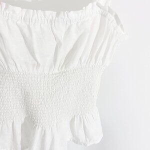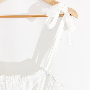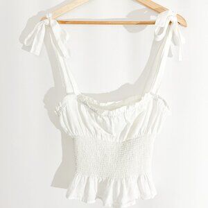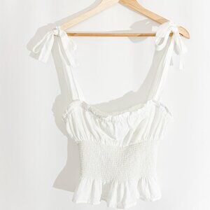Elegant cream camisole with tie straps. Features a smocked waist and ruffled hem. Perfect for layering or wearing alone.