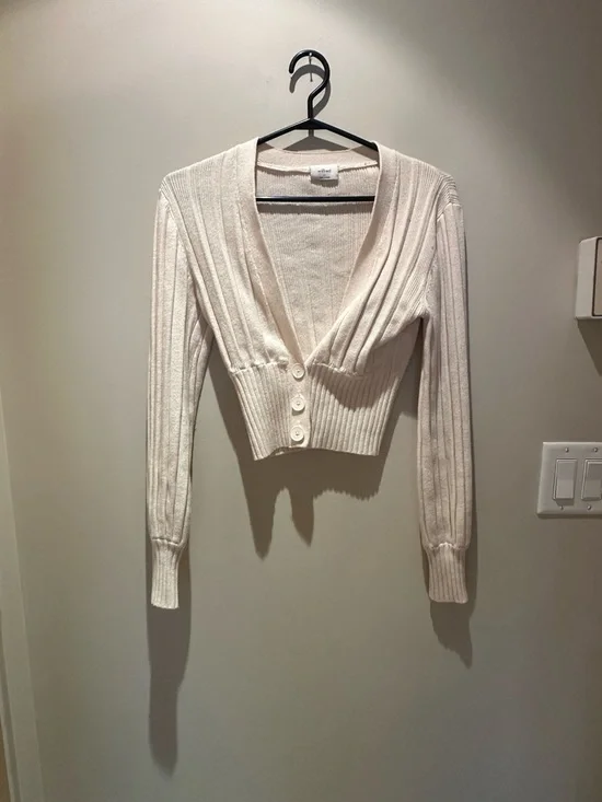 Wilfred cropped cardigan in a soft cream tone. Ribbed knit with long sleeves. Deep V-neck and three-button front. Fitted waist for a flattering silhouette.