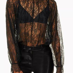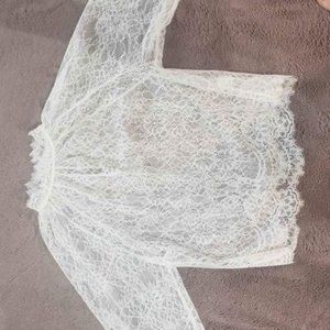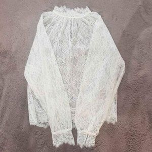 - A mock-neck white blouse with a back keyhole cutout made with lightweight floral lace.