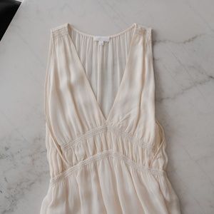 This Wilfred dress is a size Large and measures 33 inches in length from the front and 39 inches in length from the back. The waist has a stretchy band and starts at 13 inches across when relaxed but can stretch to 20 inches across so it has a nice comfortable fit.