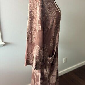 Long, open-front jacket with a self-tie belt and patch pockets. It’s made with hand-clipped, semi-sheer jacquard with intricate floral detailing:  Aritzia Wilfred.