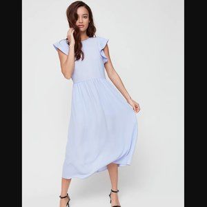 Description: This dress has a fitted bodice that emphasizes the waist, flutter sleeves, and a full, A-line skirt. It's made with a drapey, matte fabric from Japan.