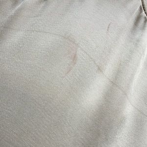 Two tiny stain lines noted (faded ruby) as pictured to the top right back. Haven’t tried to remove it by washing it or dry cleaning it!