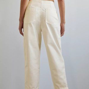 These are high-rise pants with back patch pockets, front pleats and subtle topstitching. They’re made with a washed cotton blend.