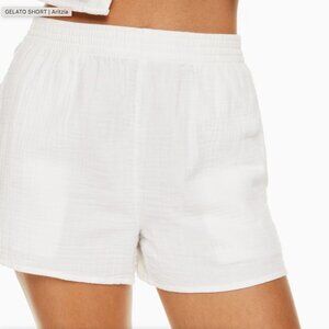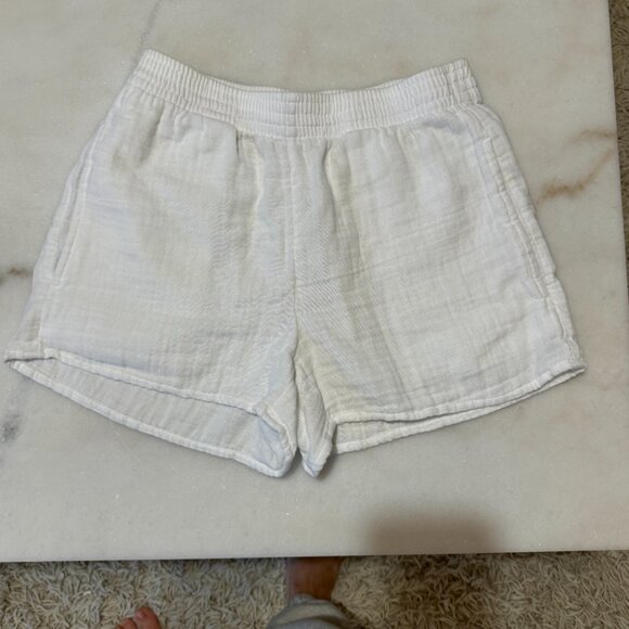 These are relaxed, high-waisted shorts with inseam pockets and an elastic waistband.
