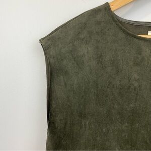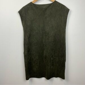This simple and streamlined shift dress is made with army green faux suede has a soft, boxy silhouette you can wear in any season. The dress is finished with large patch pockets and feminine short sleeves — long story short, you'll love it.