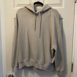 This is a relaxed-fit, pullover hoodie with dropped shoulders. It's made from heavy fleece fabric.