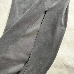 Velvet soft feel. Very slight stretch. Slits on both sides (shown in photo), I’m 5’3 and it comes to my mid calf. Machine washable. I’ve always wash on cold and always hung to dry.