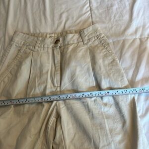These are high-rise, pleated pants with a horn button detail. They're made with brushed cotton twill fabric. Excellent khaki pants for summer. EUC Measurements are approximate. Stock photo different color it's to show fit only.