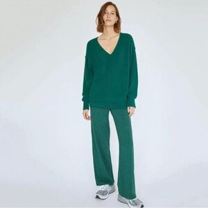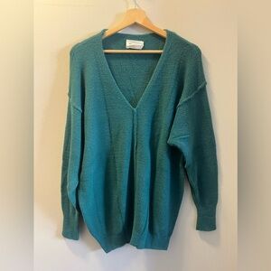 Great condition as barely worn and washed accordingly. This is a V-neck sweater with dropped shoulders and fully fashioned construction. It’s knit with Wilfred Free’s Hush Knit — plush, cuddly soft Italian chenille yarn. It's constructed with a Jersey stitch for a soft drape and a smooth, flat feel.