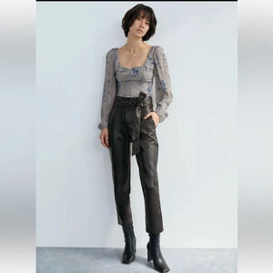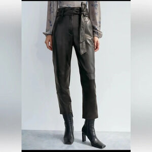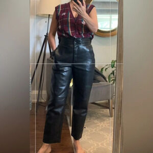 These are high-rise pants with a relaxed fit, tapered leg and removable self-tie belt. They're made with our innovative Vegan Leather that looks and feels like the real thing. They use to have loops with a tie belt I cut them off the belt was to bulky and kept untying. See last three photos it is virtually unnoticeable unless you zoom in. EUC buttery soft just like there Malina pants.