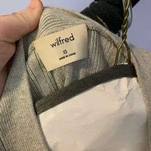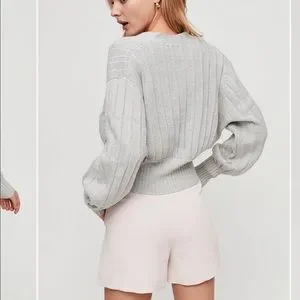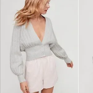 Stylish gray ribbed cardigan. Features a deep V-neck and button closure. Perfect for layering.
