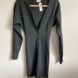 Sweater dress 2.0 This is a fully fashioned cardigan sweater dress with a V neckline and a rib-knit lower body. It's knit with Wonder Yarn — the lightweight yarn that lives up to its name. This peachy soft yarn offers the all-season warmth of wool, without the wool. It’s made with LENZING™ ECOVERO™ Viscose. This garment is constructed using a Fine Rib stitch with thin, compact columns for comfortable widthwise stretch, plus a Jersey stitch for a soft drape and a smooth, flat feel.