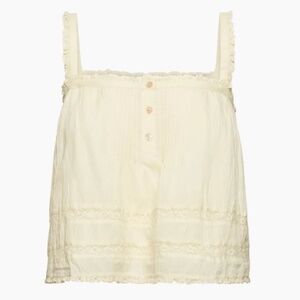 Chic ivory camisole with lace accents. Features button front and wide straps. Ideal for layering or standalone wear.