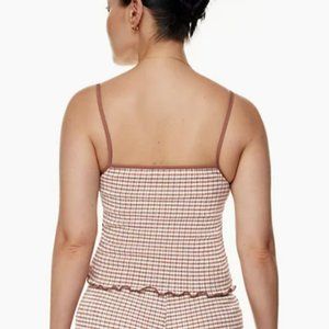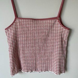 This is a thin-strapped tank top with a straight neckline and lettuce-edge hem. It's made with textural Japanese seersucker with a hint of stretch.
