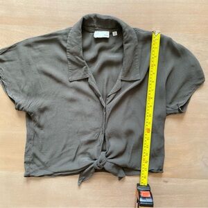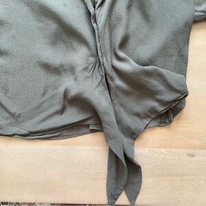 Stylish khaki button-down with tie-front detail. Ideal for casual wear.