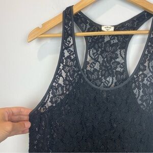Floral Lace Racerback Tank Top with satin trim around neck, arms and hemline.