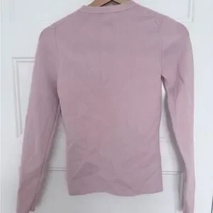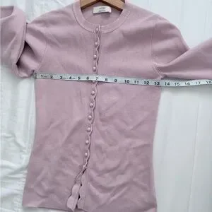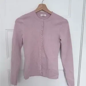 Wilfred button-down cardigan in a soft mauve hue. Round neckline with scalloped button placket. Long sleeves and fitted silhouette. Lightweight knit suitable for layering.