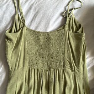 Chic olive green midi dress with a sleek silhouette. Features a stylish side slit. Perfect for versatile wear.