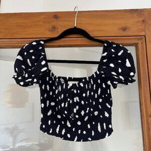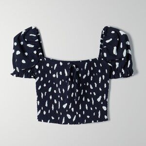 This is a smocked, puff-sleeve prairie blouse with a square neckline and tie-front detail. It's made with lightweight fabric that has a subtle pebbled texture. This version comes in a custom print that was designed in-house.