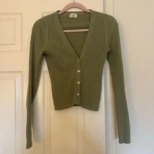 Slim ribbed V-neck cardigan in olive. Button-front closure with subtle pearl buttons. Lightweight stretch fabric for easy layering. Clean, minimalist silhouette for everyday wear.
