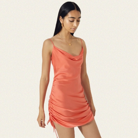 This is a ruched slip dress with a cowl neckline and flattering bias cut. Adjustable side ties mean it can be worn either short or long. It's made from glossy Japanese satin that glides against your skin.