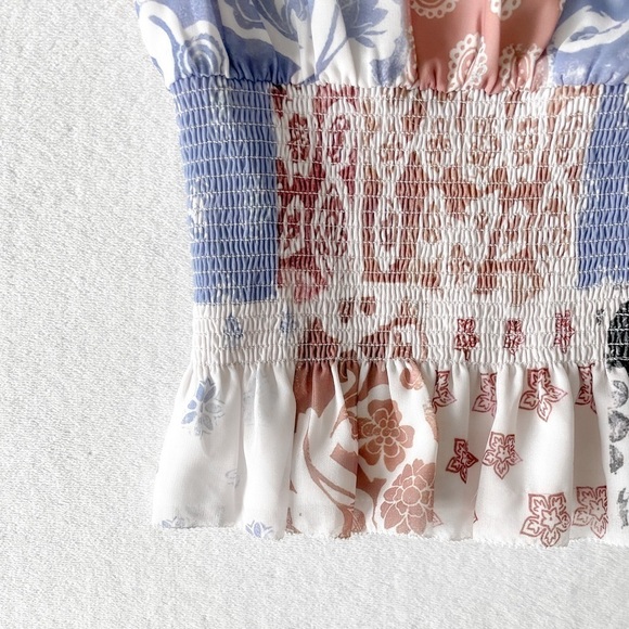 This is a tie-strap camisole with a smocked bodice and a ruffled hem. It's made from lightweight, semi-sheer fabric. The hand-drawn print was designed in-house.