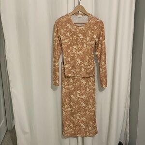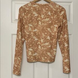 Wilfred stretchy patterned cream and camel long sleeve top. There is a matching pencil/tube skirt in my closet as well. This ad is only for this top only.