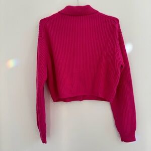 Vibrant pink sweater. Button-up front. Ribbed texture. Long sleeves.