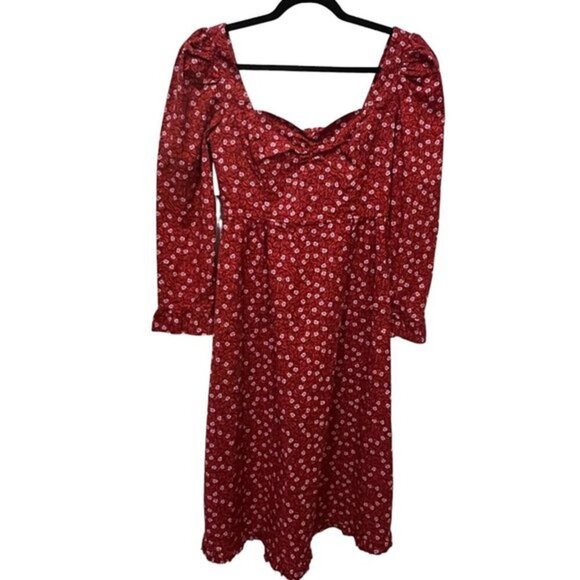 This is a long-sleeve, prairie-style dress with ruffle trim at the neck, shoulder, and hem.