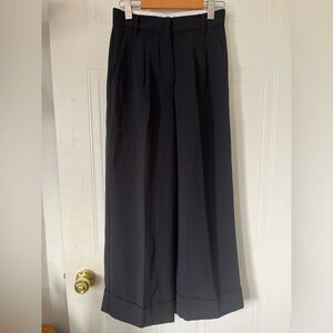 These are high-rise, pleated trousers with a wide leg. They're made with a matte, drapey fabric from Japan.