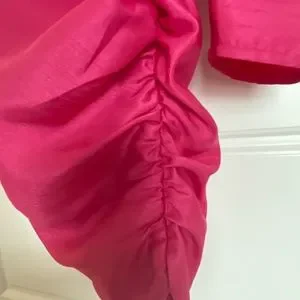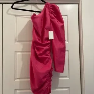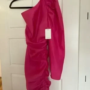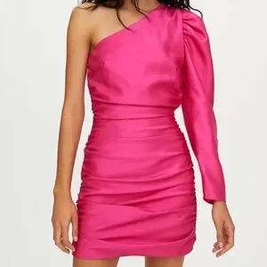 This is a one-shoulder, bodycon, mini dress with gathered side seams and a single, taffeta puff sleeve. It's made with shiny satin fabric.