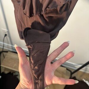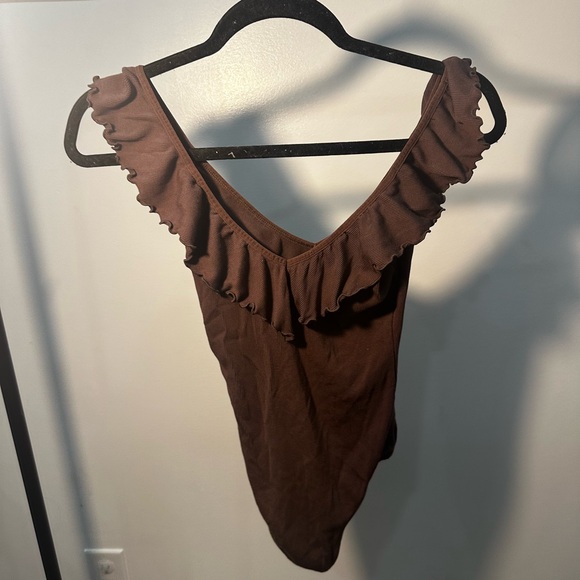 Chic purple bodysuit with ruffle detail. Ideal for versatile styling.