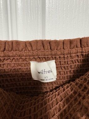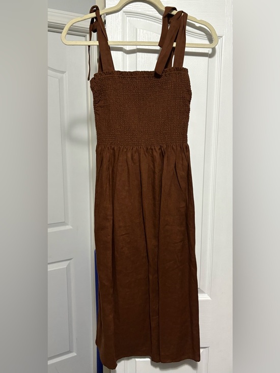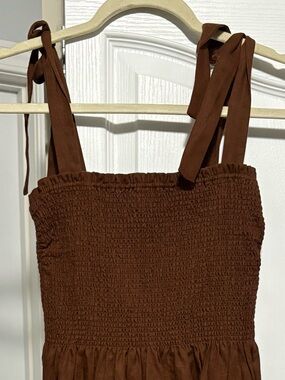 NEVER WORN. Size xs smocked bodice with elasticized texture. Adjustable shoulder straps and a flowing skirt. Earthy rust-brown hue. Lightweight linen fabric.