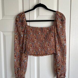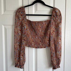 This is a square-neck blouse with a smocked bodice and puffed sleeves with elastic cuffs. It's made with lightweight, semi-sheer chiffon.