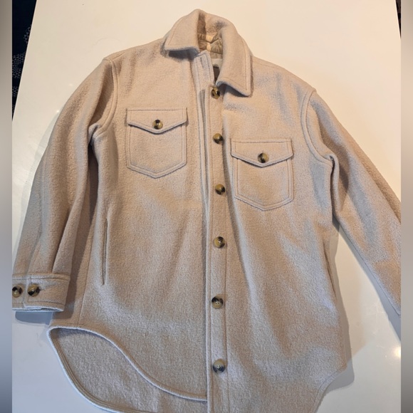 Soft textured utility shacket with button-front closure. Features flap chest pockets and tonal buttons. Slightly curved hem for a relaxed fit. Long sleeves and easy layering piece.