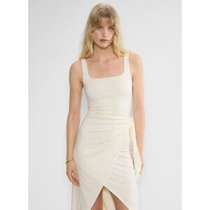 Meet your new go-to resort piece: the Saturn Midi Dress from Wilfred by Aritzia. This slim-fit wrap dress drapes beautifully, with a skirt that ties at the side for an effortlessly chic silhouette. Crafted from GoodLux fabric — luxuriously soft, lightweight, and sustainably made with LENZING™ ECOVERO™ Viscose — it’s as comfortable as it is flattering.